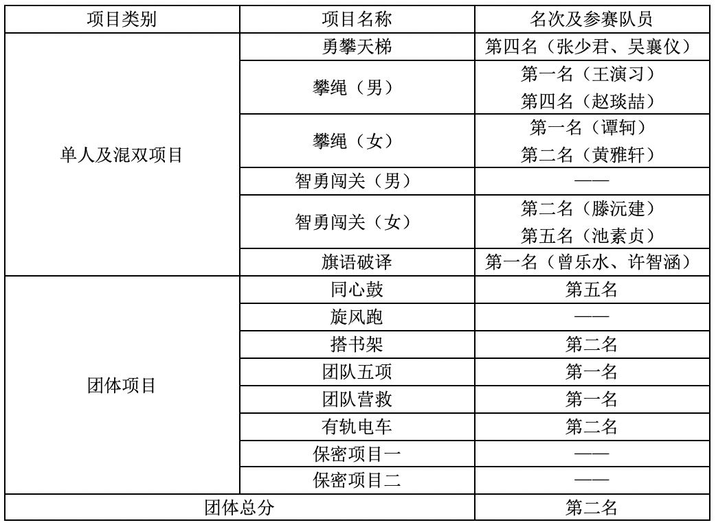 25日的比赛以单人项目为主,主要包括勇攀天梯、攀绳和智勇闯关。经过与参赛各大高校成员的激烈角逐,北大拓展队成员王演习、谭轲分别夺得男子攀绳、女子攀绳冠军,滕沅建获得女子智勇闯关亚军。