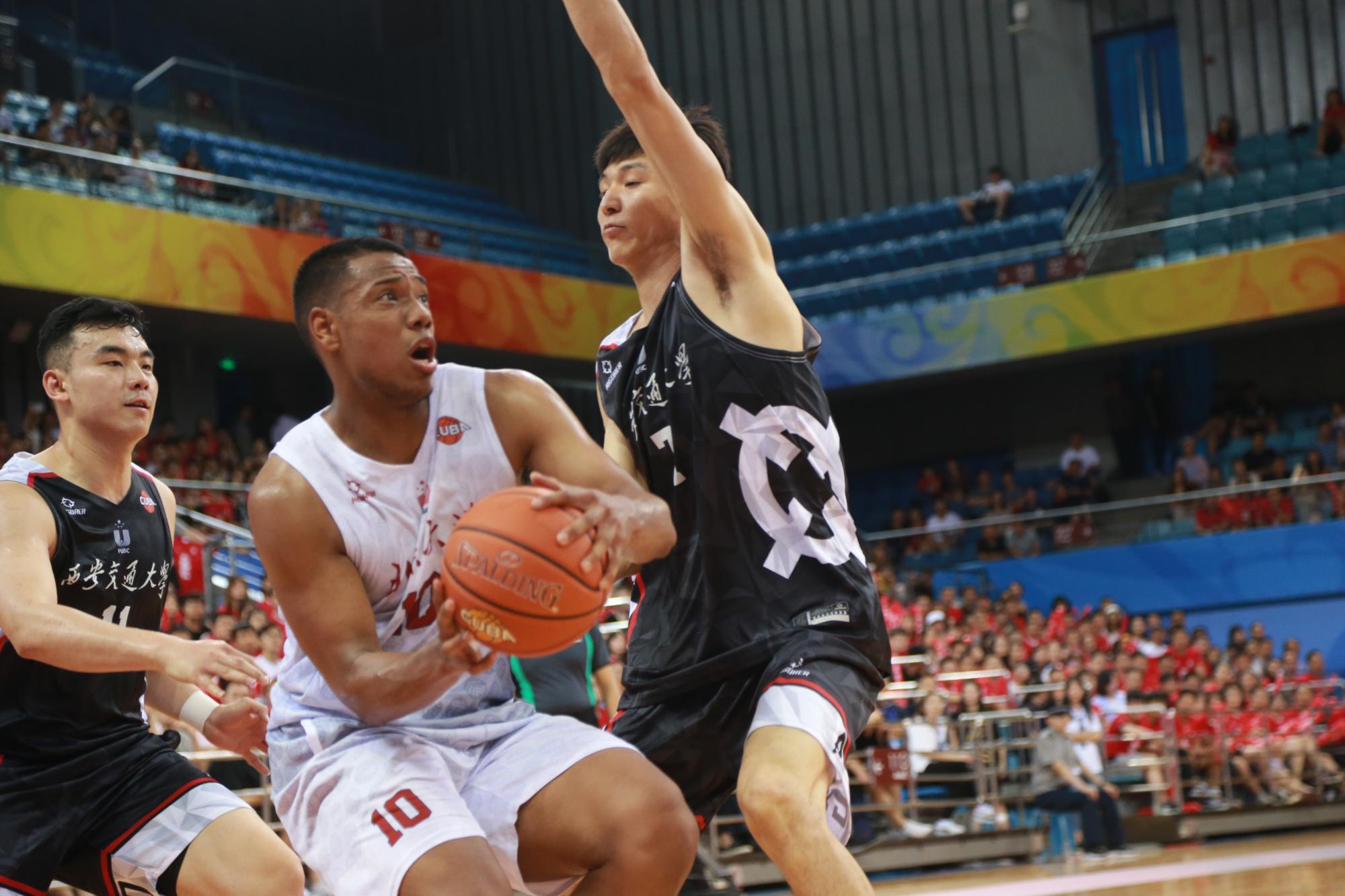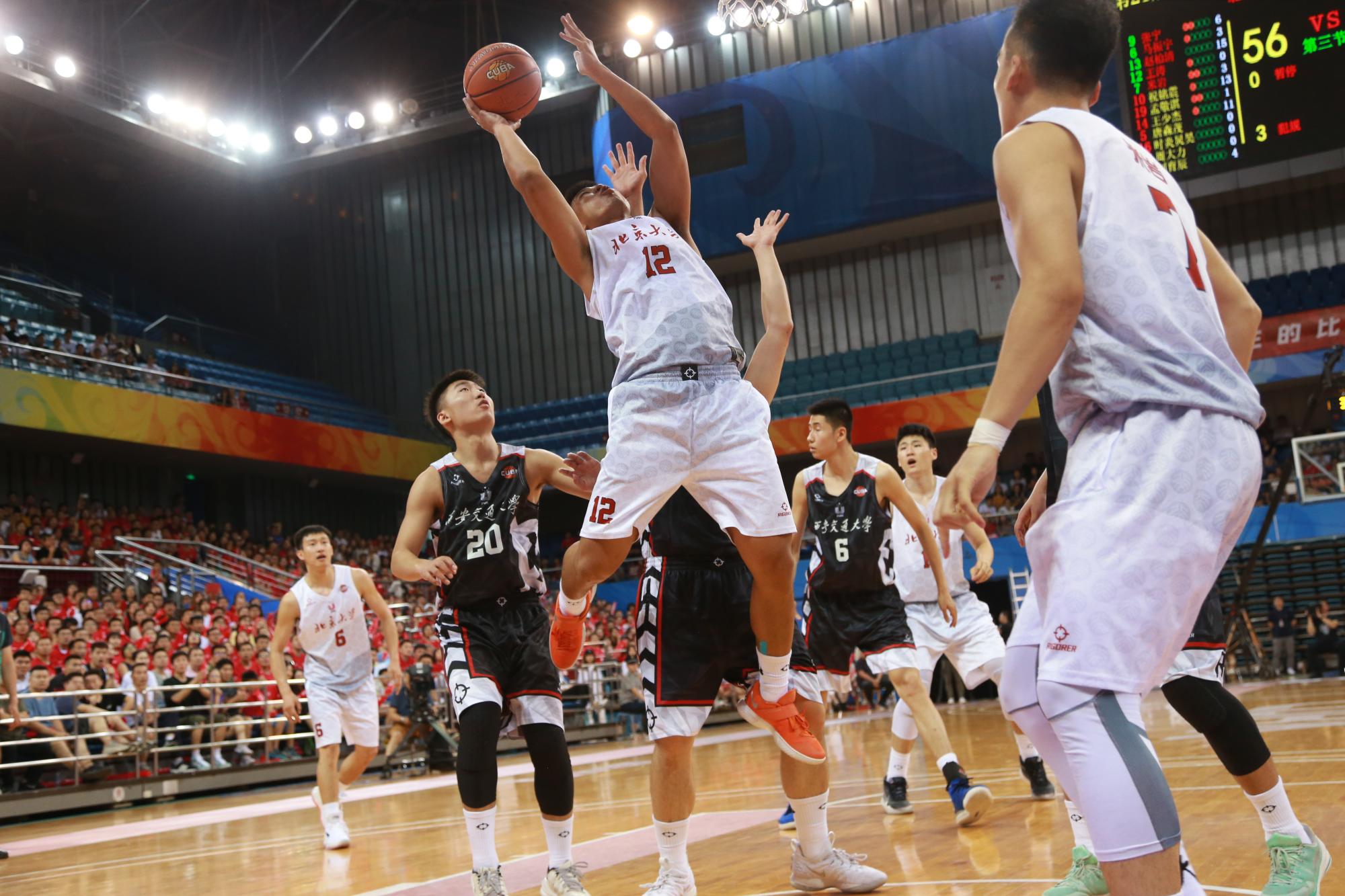 下半场比赛北大开始逐步发力,在防守端不断给对手制造困难,使得西安交大单节仅仅得到11分,张宁不断突破内线制造杀伤,祝铭震、刘育辰也在外线连续命中,西安交大第三节后半段陷入得分荒,被北大迅速拉开15分的分差。
