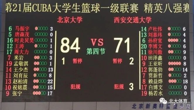 北京大学赵柏清22分10篮板,张宁17分12篮板,祝铭震15分,王少杰13分8篮板。西安交大赖益烨18分,郭蓬勃14分。
