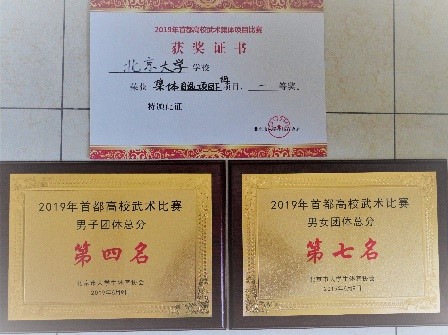 首都高校武术比赛高手如云,一些高校则是由武术高水平运动员代表出战,北京大学武术队普通生运动员与高水平运动员同台竞技,稳定发挥,夺得了集体项目冠军,五个单项冠军,男子团体总分第四名,团体总分第七名的好成绩!
