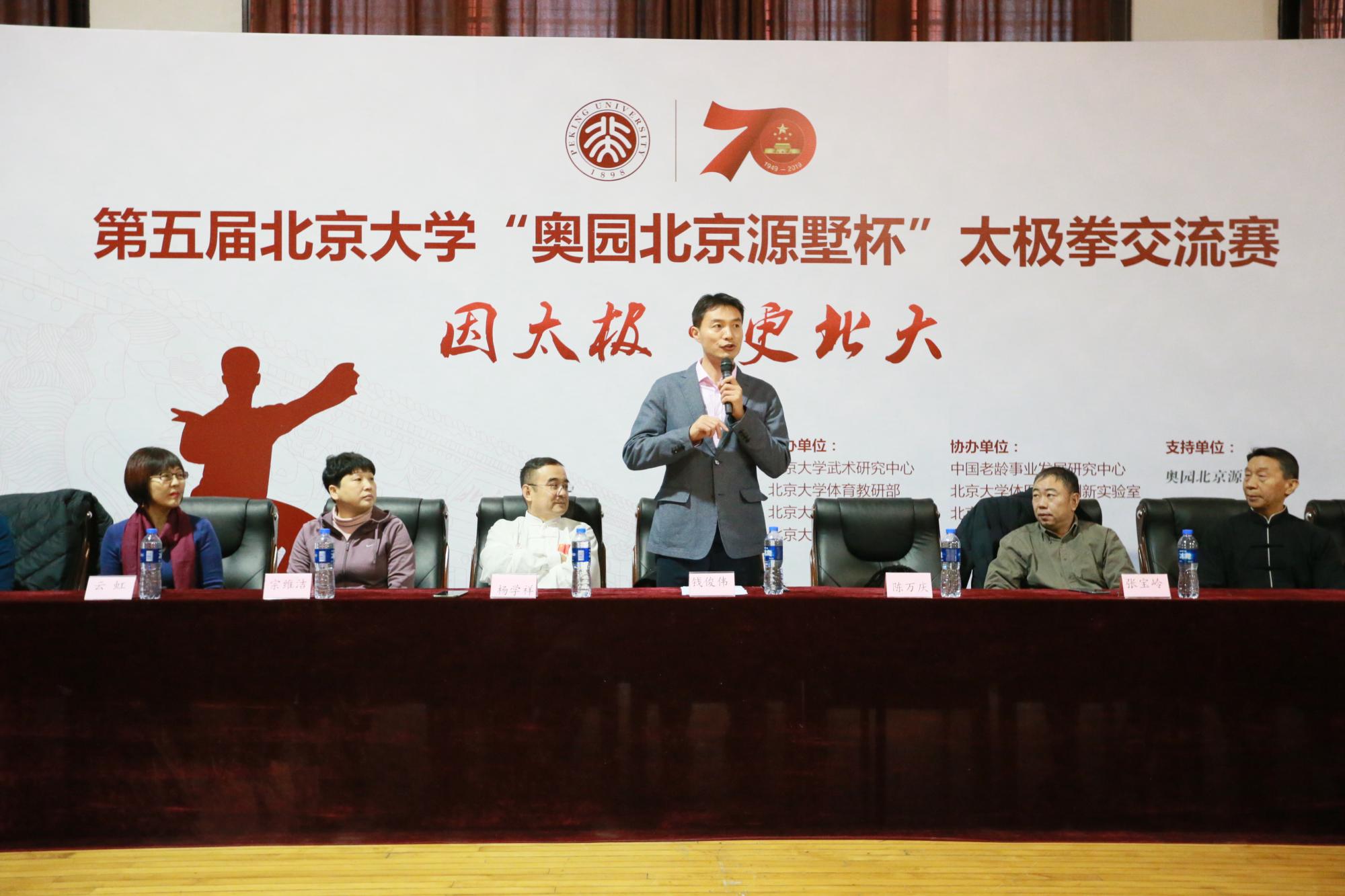 钱俊伟主任表示太极拳运动在北大有很深的传统,今年还走出国门,到西班牙进行了巡演,既传播中华优秀传统文化,也进一步增进了国际友谊。他认为太极拳博大精深,不仅仅是一门传统功夫,更是一种人生哲学。而随着健康观念从注重“治已病”到注重“治未病”的转变,太极拳运动的习练、交流和切磋也显得更加必要,他希望通过太极拳运动,将传统文化与现代健康理念相结合,加强师生校友的健康意识,倡导健康文明的生活方式,让更多的人产生运动兴趣,促进校园健康机制的建设和发展。同时,他还对本届大赛的赞助方表示了感谢。