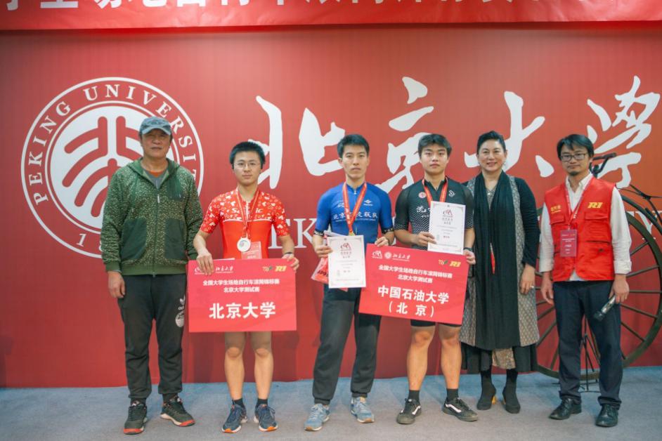 比赛最终圆满结束,下午4点,进行了颁奖仪式,大自协秘书长张锐教授,以及仲裁长中国劳动关系学院赵子江教授,和兼任颁奖仪式的大自协常务副秘书长卢福泉老师,给获奖选手颁奖。个人计时赛含金量最高的金牌,男子和女子个人综合和个人体能,分别被来自中国石油大学(北京)的彭文博和北京科技大学的安奕韦,以及中国科学院大学的俎红叶和中国矿业大学的赵紫璇获得。他们将获得JAKROO定制的象征荣誉的红色“冲刺王”和绿色“全能王”骑行服。团体项目含金量最高的金牌,男子和女子10公里接力,被中国石油大学(北京)一队和北京大学骑实很简单队获得。团体总分前三甲,东道主北京大学积分116,获得团体冠军,中国石油大学,获得亚军,总积分65,中国矿业大学(北京)积45分获得铜牌。11个项目男女前三甲请参见附录。