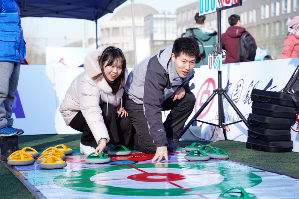 冰壶运动被喻为“冰上国际象棋”,现场的“旱地冰壶2对2及4对4团队挑战赛”,让同学们了解了冰壶运动的基本规则,体会了团队合作的力量。
