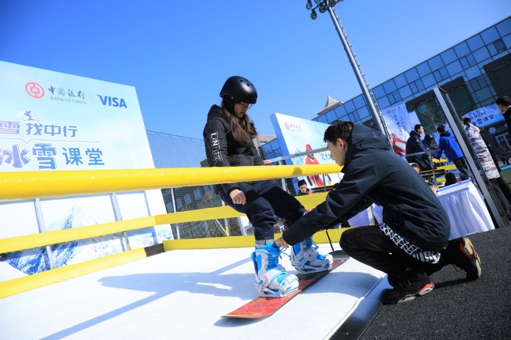 现场的“仿冰滑冰场”设置30分钟一节的滑冰培训课,让很多同学学习了解了滑冰运动的基本动作和技巧。
