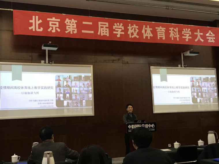 在大会报告环节中,亓昕老师在第一会场的体育课程教学与改革研究方向专场中做了《疫情防控常态化下的高校体育线上教学实践研究——以瑜伽课为例》主题报告。