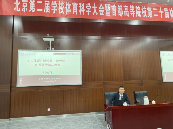 随后闭幕式上,北京大学体育教研部主任钱俊伟作题为《北大体育在建设双一流大学中的发展战略与策略》的大会主题报告,他从百廿北大 百年体育,一流体育是一流大学的重要标志,北大体育在建设双一流大学中的发展战略,北大体育在建设双一流大学中的发展策略等四个方面进行了详细汇报。