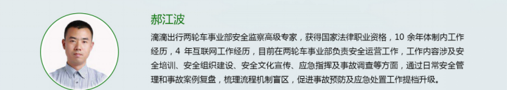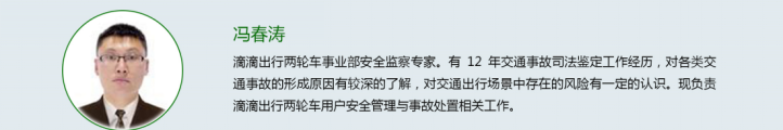 卢老师:是的,杨老师提到了官方微博推送,如北京交通局的官方微博,有500万粉丝。但对于年轻人,可能B站能发弹幕的车祸视频,更能主动吸引他们的注意。但我们发现多数B站公众号,没有对车祸的类型进行分类整理,也没有对车祸发生的原因进行系统分析,在一阵阵唏嘘中,等待下一期视频的推送。对于三大共享单车骑行服务供应商,我相信,如何让骑行者在使用他们提供的车辆服务中,安全出行,也是他们的服务宗旨。下面我们先请滴滴两轮车安全监察专家郝江波和冯春涛先生分享他们的工作和看法:如何在公众骑行出行中进行安全教育。