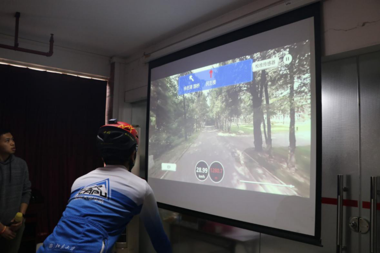 本次骑行教育的最后一个环节,是由来自北京大学的一支团队向大家展示他们开发的虚拟校园骑行导览和骑行安全教育人机交互系统。这支团队主要由北京大学的4名分属电子、智能科学和体育与健康等专业方向的本科生和研究生组成,由张锐教授和卢福泉副教授进行指导。利用全景运动相机沿北大校园内主要道路拍摄的实景视频,该系统可以使用户在固定骑行台上骑行时观看播放的实景视频,获得在北大校园内进行虚拟骑行和导览的体验。同时,系统中的传感器使用户可以通过改变骑行速度或转动车把,来实现加减速、转换视角和转向等人机交互特性。该系统还嵌入了骑行安全教育模块,可以捕捉用户在关键时间点是否做出了符合安全规范的行为,若用户行为不符合安全规范则会触发播放相应的骑行事故视频,从而达到警戒和安全教育的目的。团队期望未来能将这一系统进一步完善,并推广至全国多所高校,在提供趣味导览服务的同时促进骑行安全知识在青年学生中的普及。