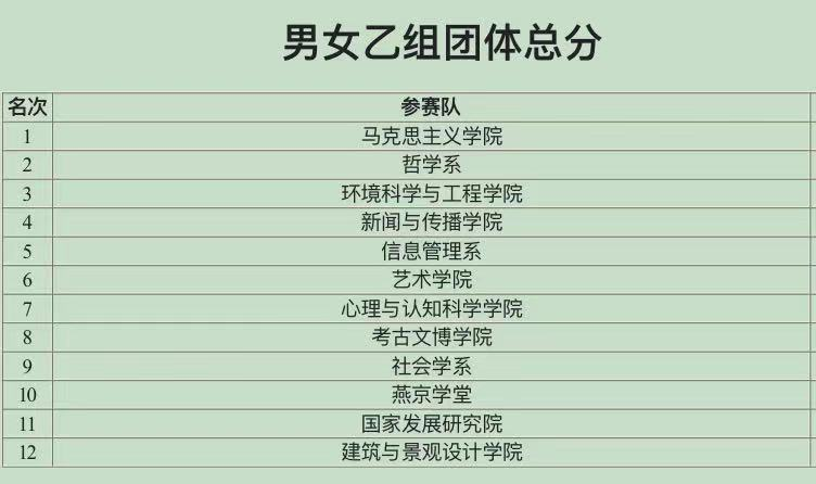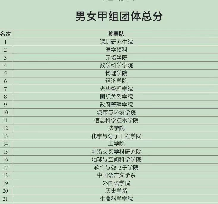 深圳研究生院、马克思主义学院分获男女甲组和男女乙组团体冠军;教工组男女团体冠军则被北大附中收入囊中。