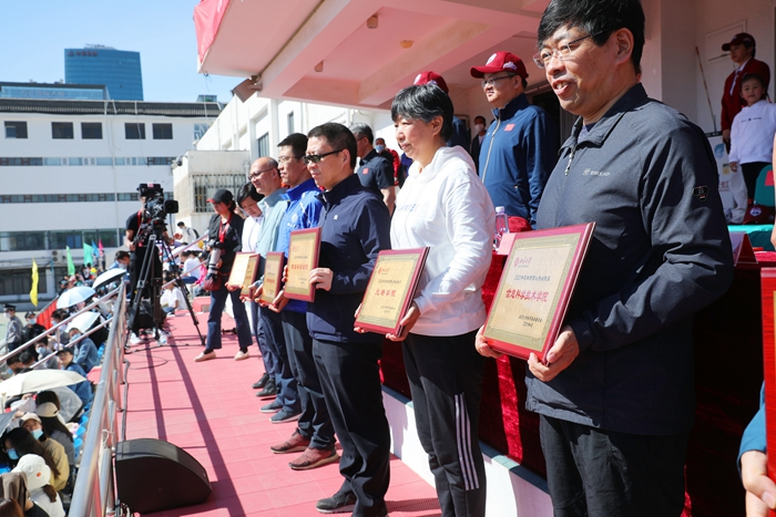 运动员、裁判员代表进行庄严宣誓;嘉宾和校领导为获得2020年“体育育人杰出院系奖”的院系颁奖。