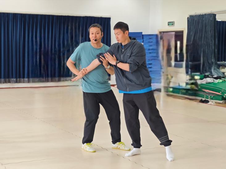 最后,教师们进行王其和式太极拳基本招式的学习。从沉稳大气的预备势、起势,到攻防兼备的揽雀尾、刚劲有力的双抱捶,再到收势时的气定神闲,杜军明细致入微地讲解和示范每一个动作。教师们认真模仿、反复练习,在一招一式中感受太极拳的独特韵味与强身健体之效。同时,杜军明老师结合王其和式太极拳的特点,向教师们传授了实用的防身知识与技能。教师们积极参与互动,主动尝试演练,在实践中提升自我保护能力。