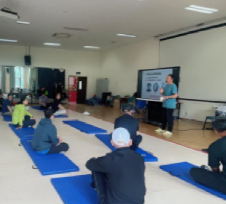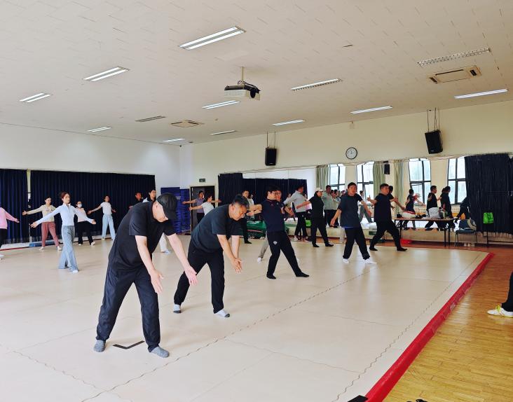 随后杜军明带领大家进行了充分的热身运动。从颈部环绕舒展到肩部旋转活动,从髋关节开合练习到膝关节绕环热身,他细致讲解每个动作的要领与注意事项,同时结合太极运动特点,强调以柔缓的节奏激活身体机能,为后续实践环节做好充分准备。