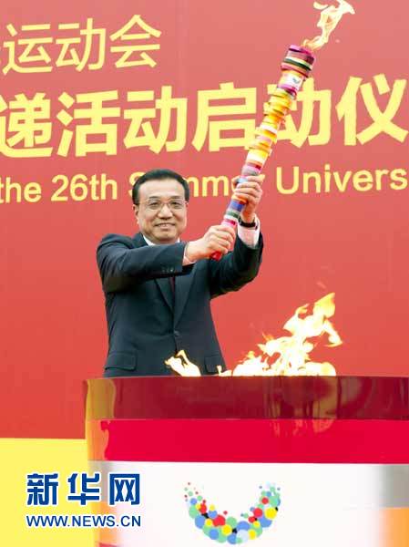 圣火传递友谊,青春拥抱梦想。深圳第26届世界大学生夏季运动会火炬点燃暨火炬传递活动启动仪式4日上午在北京举行。中共中央政治局常委、国务院副总理李克强在仪式上点燃主火炬,宣布世界大学生运动会火炬传递活动开始。
