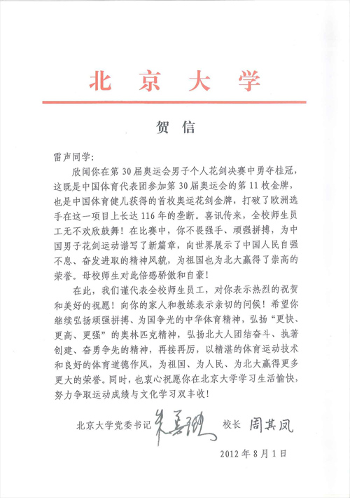 欣闻你在第30届奥运会男子个人花剑决赛中勇夺桂冠,这既是中国体育代表团参加第30届奥运会的第11枚金牌,也是中国体育健儿获得的首枚奥运花剑金牌,打破了欧洲选手在这一项目上长达116年的垄断。喜讯传来,全校师生员工无不欢欣鼓舞!在比赛中,你不畏强手、顽强拼搏,为中国男子花剑运动谱写了新篇章,向世界展示了中国人民自强不息、奋发进取的精神风貌,为祖国也为北大赢得了崇高的荣誉。母校师生对此倍感骄傲和自豪!