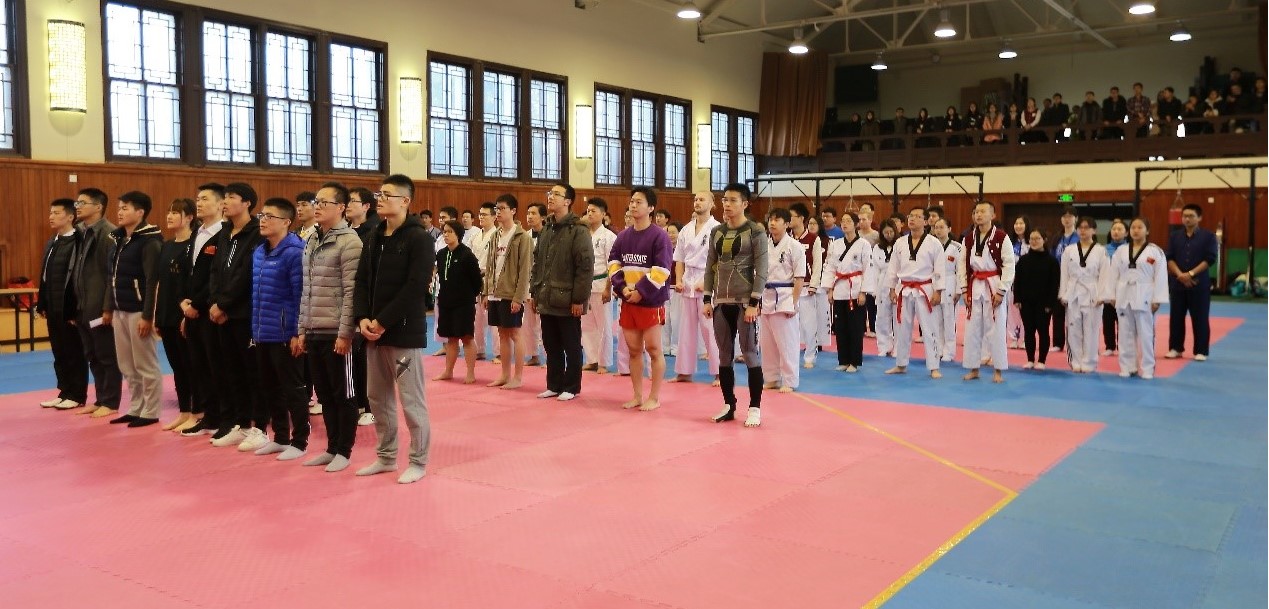 第一项便是庄严肃穆的奏国歌仪式,全体人员面向国旗奏唱国歌;随后李宁主任以及郑延林嘉宾分别作了精彩的讲话,肯定了本次大会对于学校体育运动的积极性推动作用;接下来是运动员代表唐爽代表全体运动员宣誓,严格遵守比赛规则、服从裁判、尊重对手,赛出风格,赛出水平;裁判员代表郑绪恒代表全体裁判员庄严宣誓,坚决服从裁判长指挥,保证文明裁判、秉公办事。宣誓结束后,大会仲裁毛智和老师讲解了比赛的注意事项及要求;最后,由李宁主任宣布演武大会正式开幕!