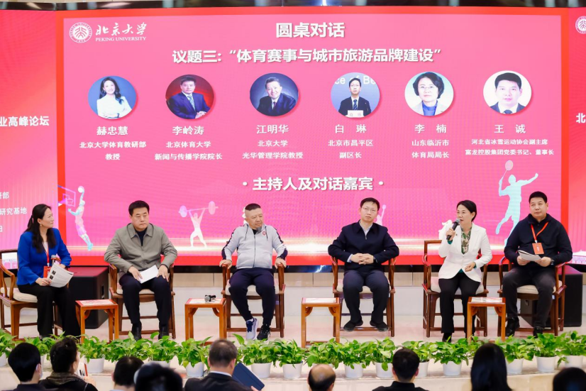 为更好地探索体育赛事与城市旅游品牌建设的新路径,进一步推进未来文体旅融合升级,实现体育可持续发展目标。专题报告环节结束后,又先后展开了两场精彩纷呈的圆桌对话。首先,北京大学体育教研部教授赫忠慧主持了以“体育赛事与城市旅游品牌建设”为主题的圆桌对话。参加对话的嘉宾为:北京市昌平区副区长白琳 、山东临沂市体育局局长李楠、北京大学光华管理学院教授江明华 、北京体育大学新闻与传播学院院长李岭涛和河北省冰雪运动协会副主席、富龙控股集团党委书记、董事长王诚。来自政界、学界和业界的五位专家分享经验和观点,跨界交流研讨体育赛事与城市旅游品牌建设的新趋势,从跨学科、打造品牌特殊性的视角出发, 为体育赛事助推城市发展拓展新空间。