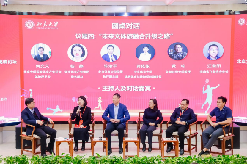 接着,北京大学国家体育产业研究基地秘书长何文义主持了以“未来文体旅融合升级之路”为主题的圆桌对话。北京体育大学学报执行副主编许治平、北京体育大学休闲体育与旅游学院副院长蒋依依 、湖北体育产业集团常务副总杨静 、海南省飞盘协会会长汪若阳和首都经贸大学教授黄琦五位对话嘉宾畅谈“未来文体旅融合升级之路”,一致认为,伴随“跟着赛事去旅行”成为一种生活方式,我国文体旅产业必将以厚积薄发之势,加强文化、体育、旅游活动一体谋划、一体开展,推出一批“体育+文旅”优质文体旅融合产业项目,让人民群众从文体旅融合发展中得到更多物质与精神满足,是新时代体育发展的核心要义,同时也指出,文体旅融合发展正当其时,但应因地制宜,方能行稳致远。