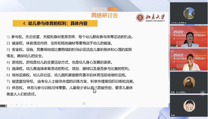 国家体育总局青少司全国幼儿亲子体育高级别专家、北京大学妇女儿童体育研究中心主任、北京幼儿体育协会会长董进霞教授做了题为《幼儿参与体育的权利与保障》的主旨报告。她指出,新《体育法》已将幼儿体育纳入其中,幼儿参与体育的权利已成为受到法律保护的关键问题。然而当前我国青少年幼儿的健康状况不容乐观,幼儿参与体育权利被忽视或侵犯的情况时有发生。结合我国的国情、幼儿的特点以及幼儿体育的特点,董教授建设性地提出了构建我国幼儿参与体育权利的基本原则,包括平等参与原则、幼儿利益最大化原则、安全参与原则,以及遵循幼儿意愿的原则。她还进一步提出,幼儿参与体育的权利的基本内容包括参与权、健康权、安全权、游戏权、选择权、场地设施权、被适宜指导权、休息权。最后,董教授指出,应构建政府、行业协会、培训机构、高校和科研机构、幼儿园,以及家庭和社区“六位一体”的幼儿参与体育权利的保护网络。