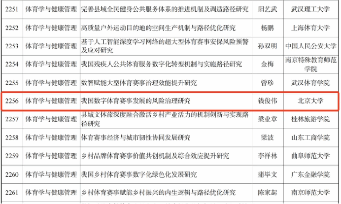 在科研立项方面,钱俊伟老师主持的《我国数字体育赛事发展的风险治理研究》获批2025年国家社科基金年度项目;钱永健老师主持的《高校体育课程思政“引导模型”的理论与实践研究》获批教育部人文社会科学研究规划基金项目;张晓圆老师主持的《北京市超重肥胖大学生体重管理策略研究》获批北京市教育科学“十四五”规划2025年度一般课题。