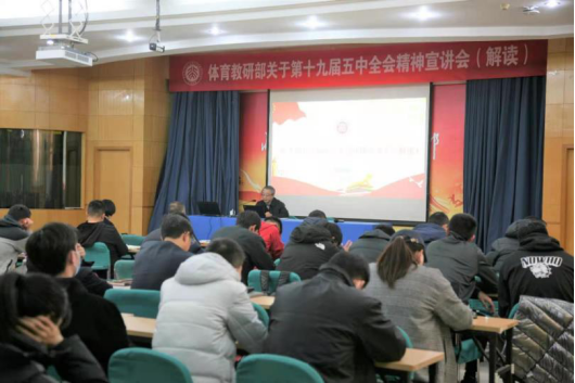 为学习贯彻党的十九届五中全会精神,深入理解“十四五”规划和二〇三五年远景目标的内涵与要求,全力推动北大体育工作迈上新台阶,2020年12月4日下午,体育教研部直属党支部在五四体育中心205教室举办党的十九届五中全会精神宣讲会,由学校党委副书记、体育教研部直属党支部书记安钰峰做专题解读。体育教研部全体教职工和研究生共同聆听报告。