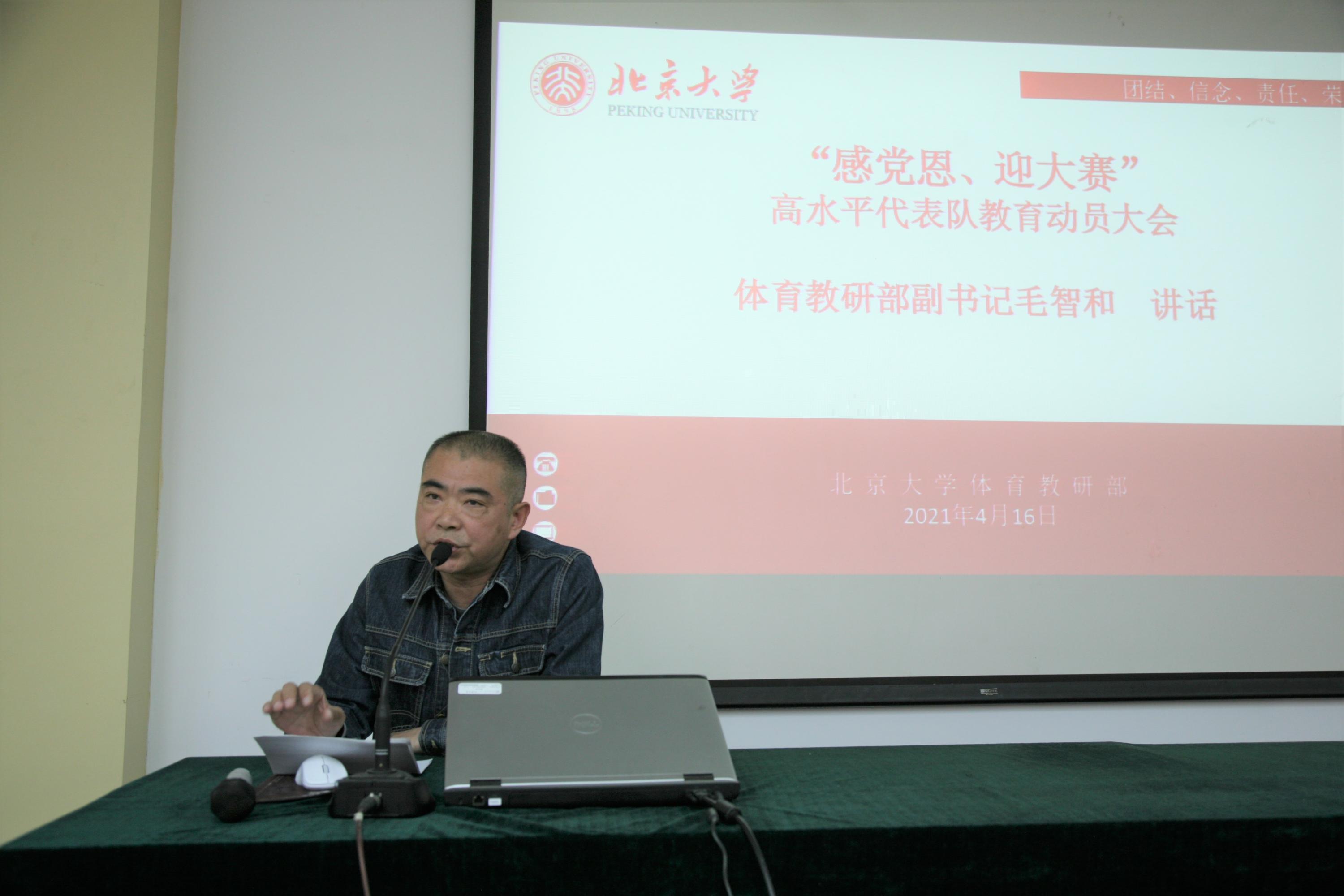 2021年4月16日,在全国各地轰轰烈烈开展庆祝中国共产党建党100周年活动之际,为了更好地完成今后的赛事任务,北京大学体育教研部召开了“感党恩、迎大赛”高水平代表队教育动员大会,体育教研部主任钱俊伟、副书记毛智和、副主任郑重、副主任刘茂辉以及全体教练员、运动员出席了本次会议,会议由体教部运动训练与竞赛管理中心主任邢衍安主持。