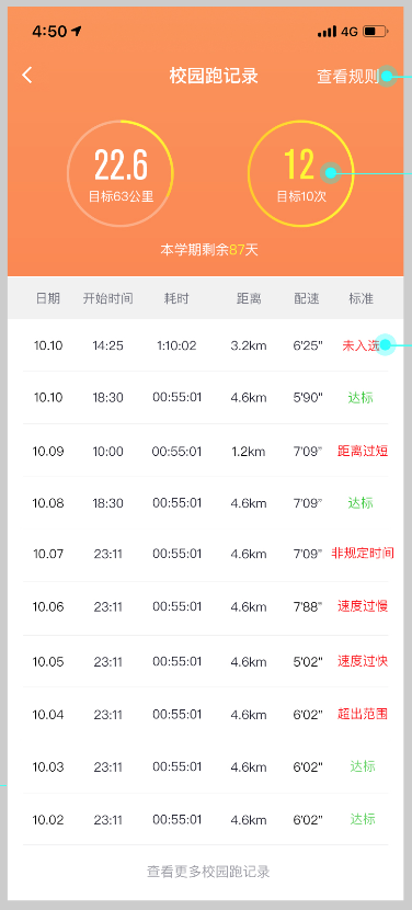 3.1、学生进入校园跑记录查询页面,可看到自己学期整体目标的进度情况,以及每次跑步的判定结果,如判定为无效也会给予原因提示,如距离过短、非指定时间或速度过慢。