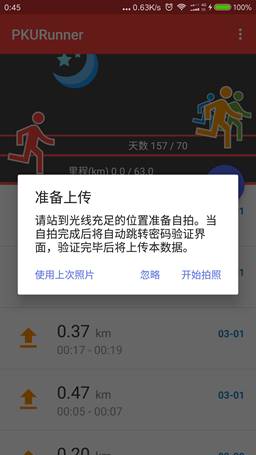 3.此时会要求拍照,本学期跑步不需要拍照,点击“忽略”即可,完成后会跳转验证界面,输入学号和iaaa密码后记录将上传。