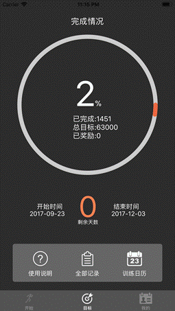 1.“目标”页面可看到本学期已经完成的里程数和百分比。