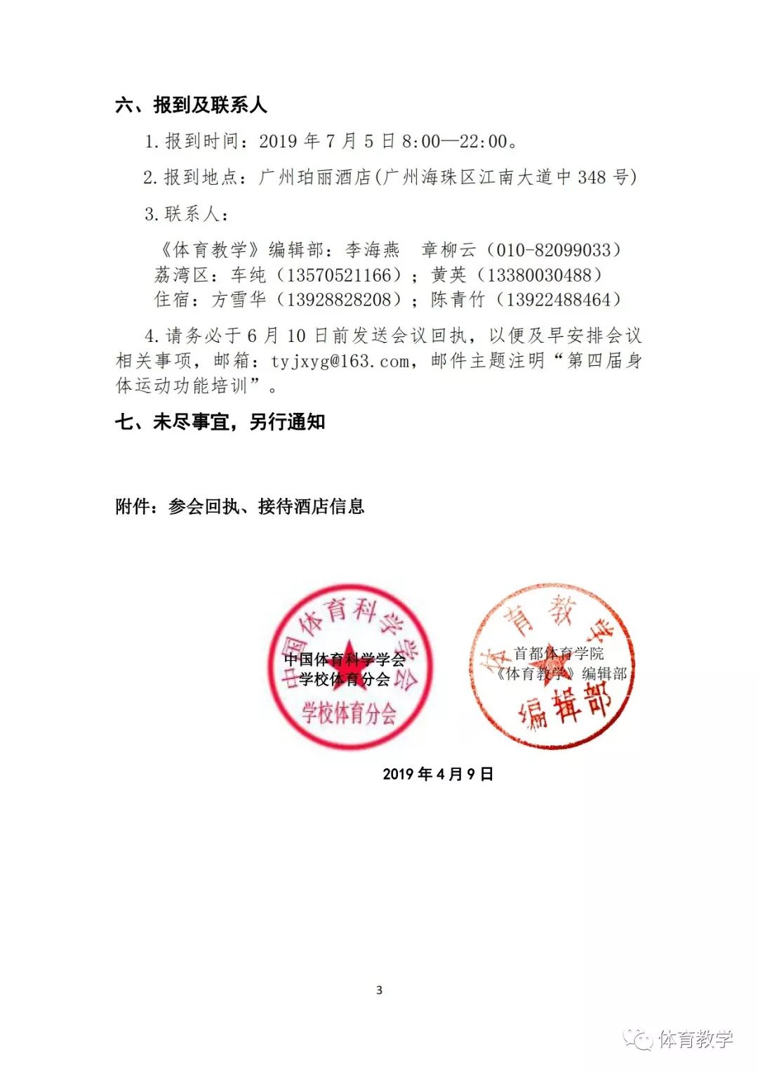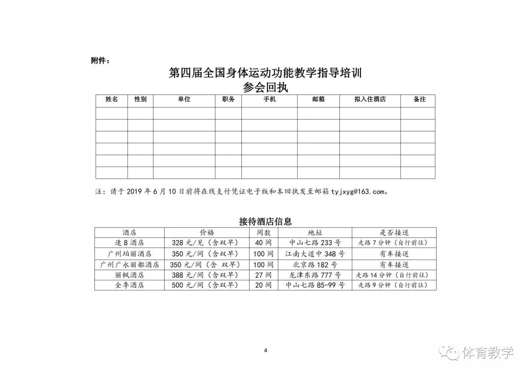 4.请务必于6月10日前发送会议回执,以便及早安排会议相关事项,邮箱:tyjxyg@163.com,邮件主题注明“第四届身体运动功能培训”。