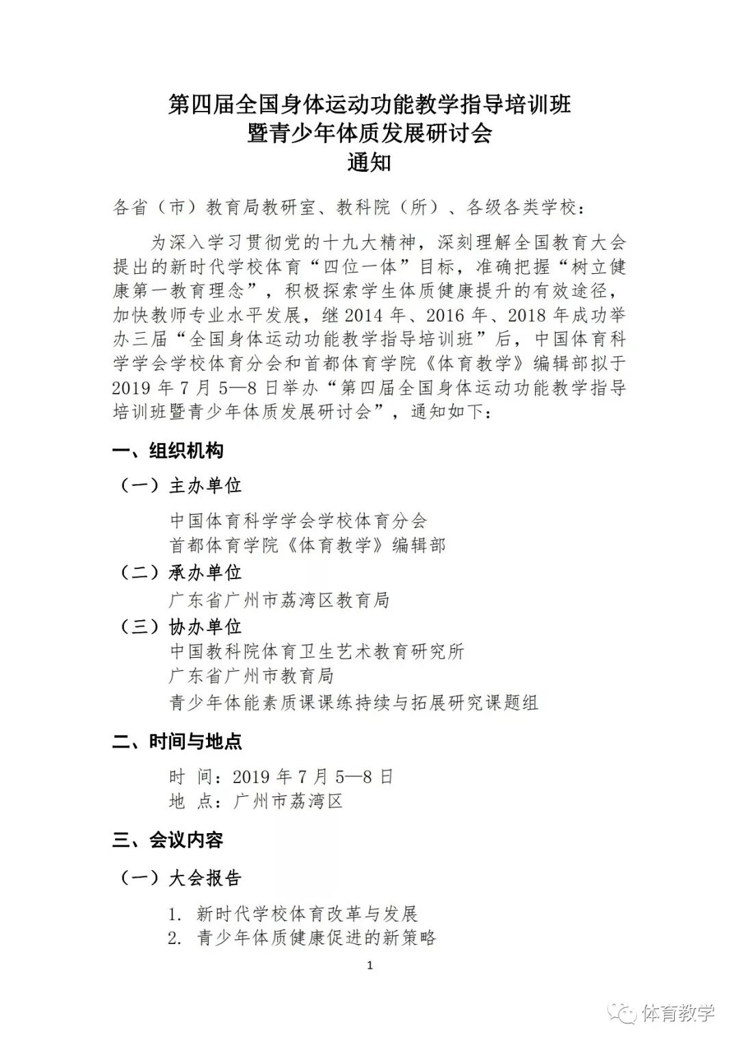 为深入学习贯彻党的十九大精神,深刻理解全国教育大会提出的新时代学校体育“四位一体”目标,准确把握“树立健康第一教育理念”,积极探索学生体质健康提升的有效途径,加快教师专业水平发展,继2014年、2016年、2018年成功举办三届“全国身体运动功能教学指导培训班”后,中国体育科学学会学校体育分会和首都体育学院《体育教学》编辑部拟于2019年7月5—8日举办“第四届全国身体运动功能教学指导培训班暨青少年体质发展研讨会”,通知如下: