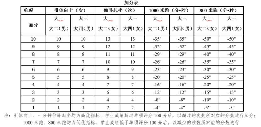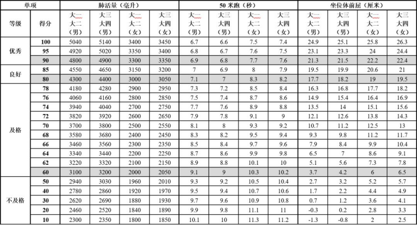 1. 2020级的本科生以及学号以14、15、16开头的本科生,体测成绩占体育课成绩的20%。保健班学生免于体测。