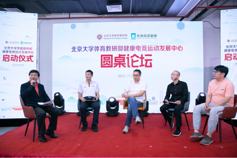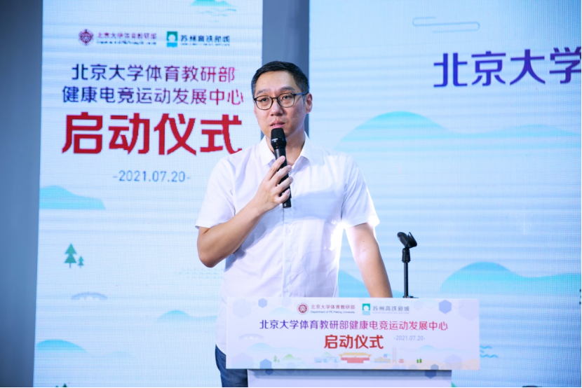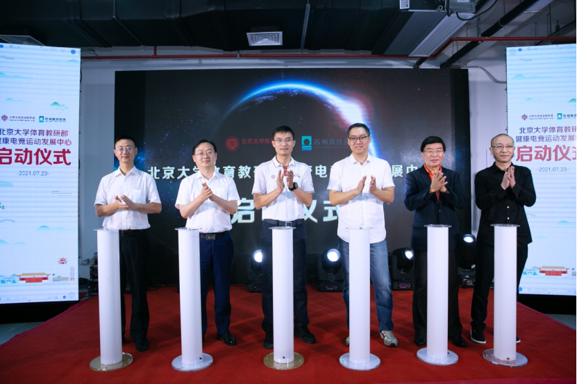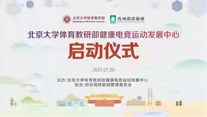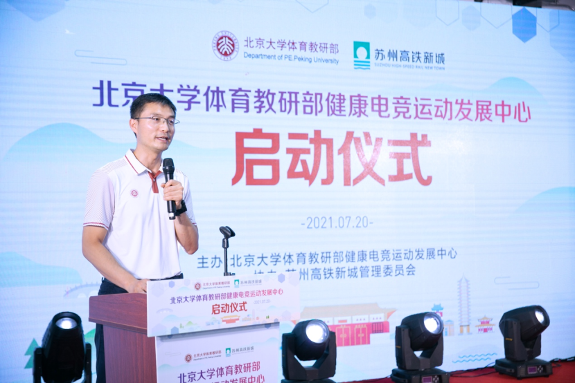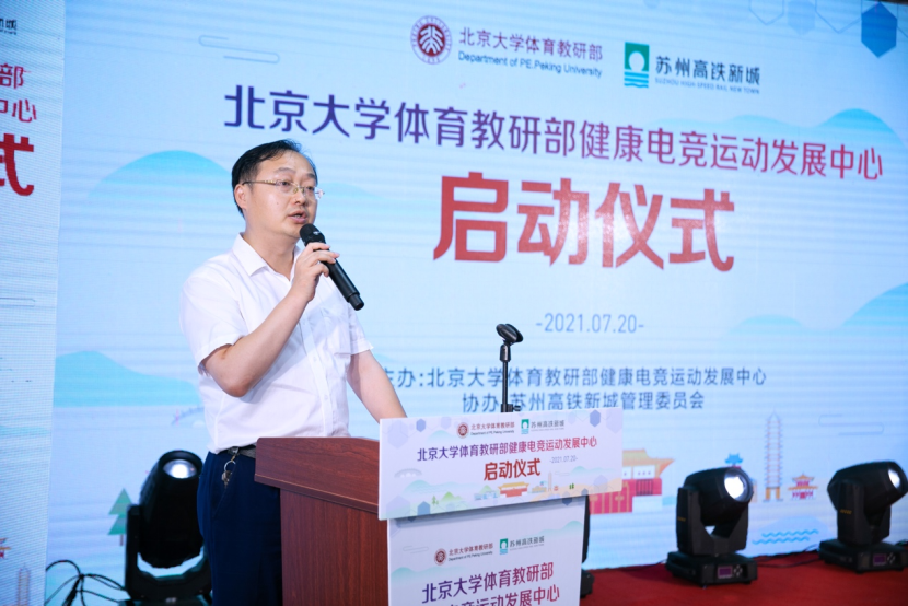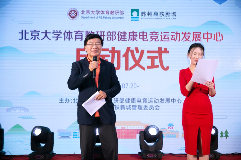 On July 20, 2021, the healthy E-sports Development Center (hereinafter referred to as the "center") of the physical education teaching and Research Department of Peking University held a launching ceremony in the high-speed railway new town, Xiangcheng District, Suzhou. The launching ceremony was presided over by famous sports commentators Han Qiaosheng and Wang Yitong, Qian Junwei, director of the sports teaching and Research Department of Peking University, Mao Zhihe, deputy secretary of the sports teaching and Research Department of Peking University, Zhang Fan, deputy director of the Management Committee of Suzhou High Speed Railway New Town, Kong Ming, Secretary General of China culture and entertainment industry association Zhang Huanzhi, Secretary General of Jiangsu E-sports Association, Chi cosmic, a famous financial writer, and other leaders and guests attended.
