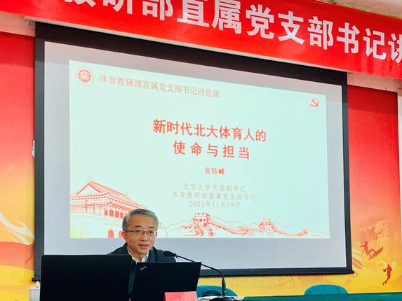 11月19日上午,校党委副书记、体育教研部直属党支部书记安钰峰,以“新时代北大体育人的使命与担当”为题,为体育教研部的师生入党积极分子上了一堂精彩生动的党课。体育教研部主任钱俊伟、副书记毛智和、学生党员、师生入党积极分子及全体2021级新生参加了本次党课学习。会议由体育教研部直属党支部副书记王东敏主持。