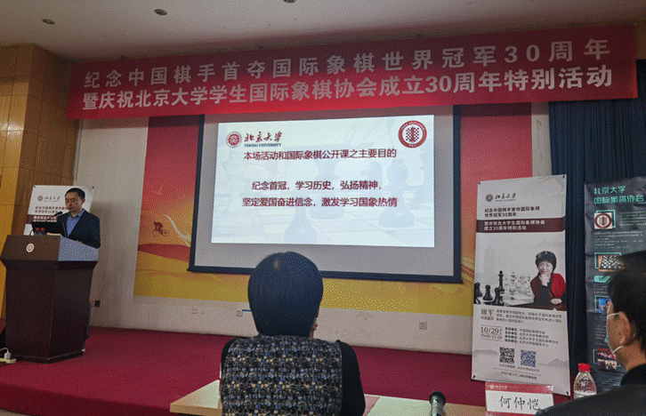 On the evening of October 29, a special event to commemorate the 30th anniversary of Chinese players winning the world chess championship and the 30th anniversary of the founding of Peking University Student Chess Association was held in classroom 205, May 4th Sports Center, Peking University. Xie Jun, vice president of Capital Institute of physical education, the fourth women's chess world champion and China's first world chess queen, Qian Junwei, director of physical education teaching and Research Department of Peking University, and Professor He Zhongkai participated in the activity. About 70 representatives of national elephant Association of Peking University students, National elephant students of the whole university and chess students of Yuanpei academy participated in the activity. The activity was attended by deputy director of United Front Work Department of the Party committee of Peking University Li Xiaopeng, instructor of national elephant Association of Peking University Students and teacher of national elephant course, presided over the meeting.