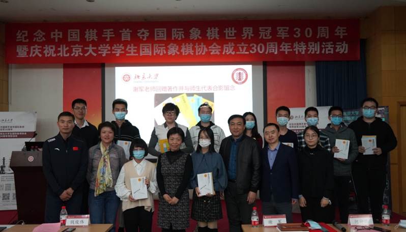 Xie Jun gave back 30 sets of the latest book "selected matches of men's world chess champions" to the teachers and students of Peking University, took a group photo with some representatives of teachers and students attending the meeting, and wrote a message of "progress in chess" for the students of Peking University.