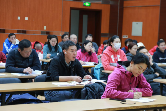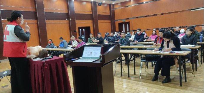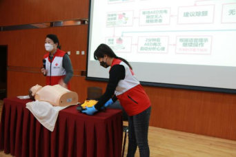 首先,培训讲师开展心肺复苏理论知识讲解,包括适用情形、步骤手法、注意事项以及AED的使用,并逐项予以操作示范。体教部教师听讲认真,关键信息记录留存,与讲师积极互动,氛围活跃。