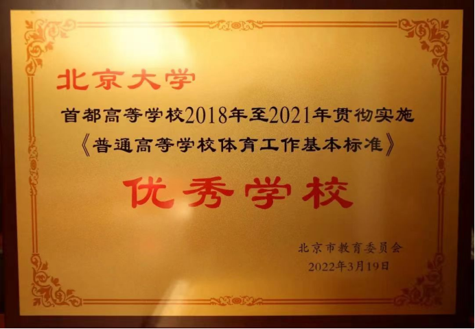 北京大学在首都高等学校2018-2021年贯彻实施《普通高等学校体育工作基本标准》评估中荣获“优秀学校”。校务委员会副主任安钰峰获得贯彻实施《普通高等学校体育工作基本标准》“优秀校长”称号。北京大学在首都高等学校2021年阳光体育联赛中同时荣获“朝阳杯”和“阳光杯”。