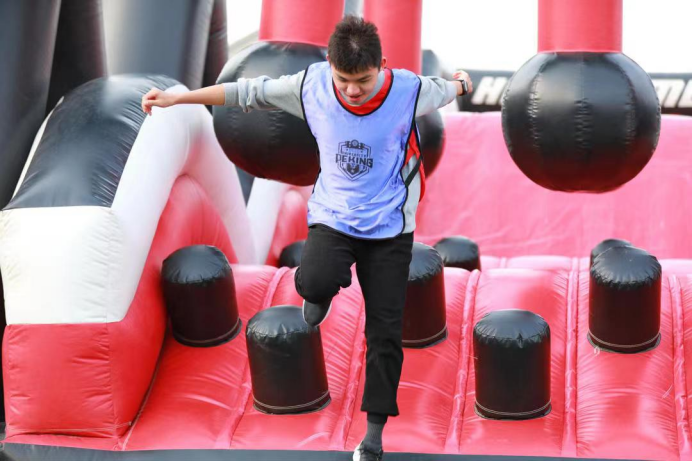 除了传统竞赛项目,新生趣味运动会的各个项目也广受欢迎。八大项目:蛟龙出海、旋风跑、毛毛虫竞速、射门大赛、团队台阶、同心鼓、High Game团队接力、室内自行车竞速赛,融合各类运动,男女混合赛制,趣味运动会项目的设置照顾到同学们多样化的运动需求,在锻炼身体、享受运动的同时,同学们彼此更加亲近,增进了友谊,增强了凝聚力,锻炼了团队合作的意愿和能力,为运动会不断增添欢声笑语以及昂扬向上的新动力。