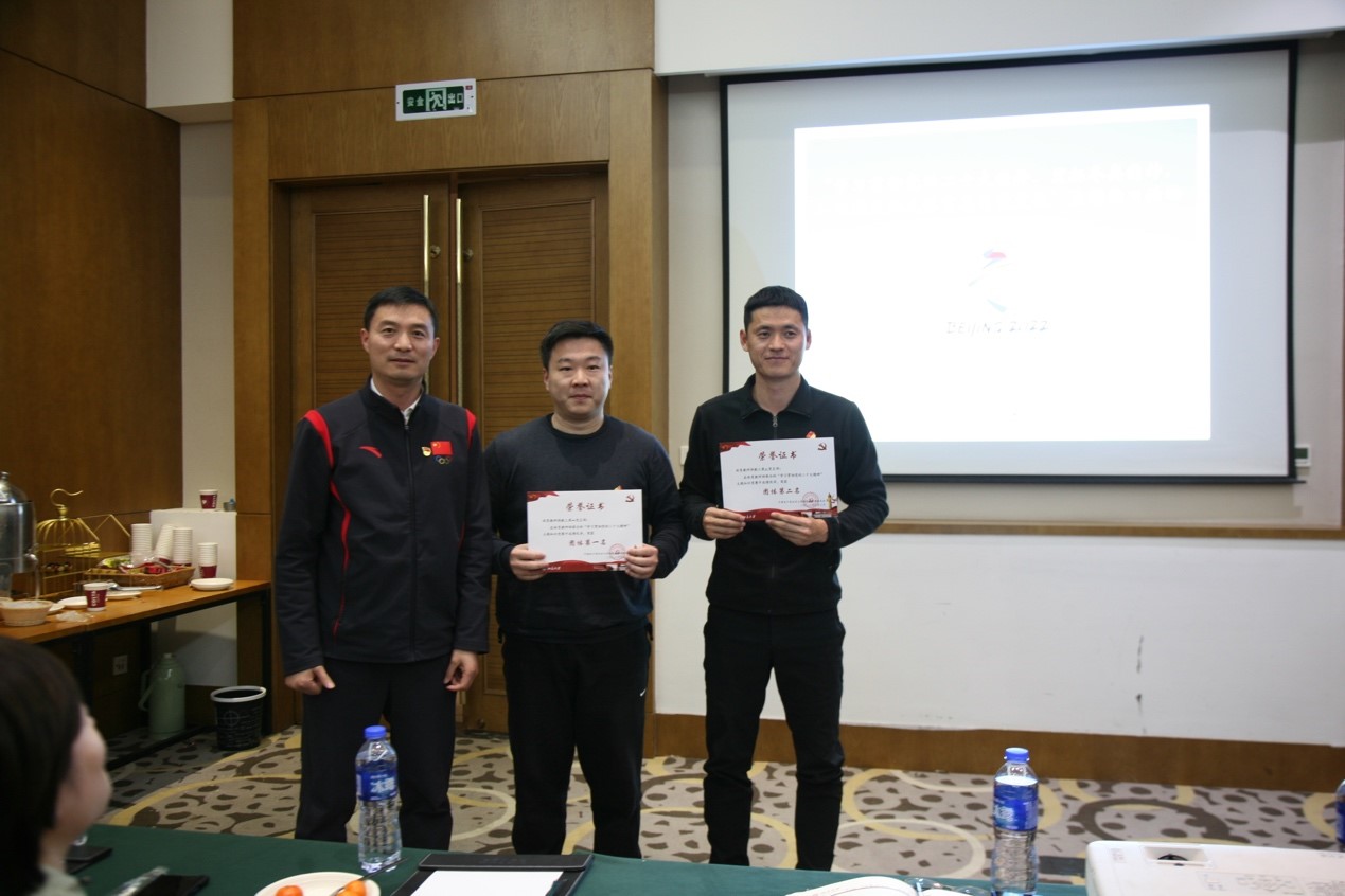 交流总结会上,由体育教研部党委副书记、主任钱俊伟为“党的二十大精神与党的基本知识”抢答竞赛进行颁奖。根据答题得分,第一党支部荣获第一名,第二党支部获得第二名。