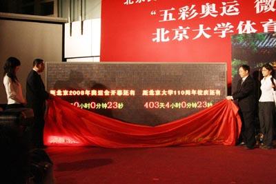 随着奥运倒计时整500天的时刻步步临近,场下身着红、黄、蓝、绿、黑五色制服的北大奥运志愿者心情愈发激昂。在全场的注目下,北大党委书记闵维方与北京团市委书记刘剑一同为北大的奥运、校庆倒计时牌揭牌,现场顿时一片沸腾。与此同时,五名北大学生身着北京奥运会吉祥物“福娃”的装束走到台上,与在场同学共同庆祝北京奥运会开幕倒计时整500天和北大110周年校庆倒计时403天,将活动气氛推向了高潮。