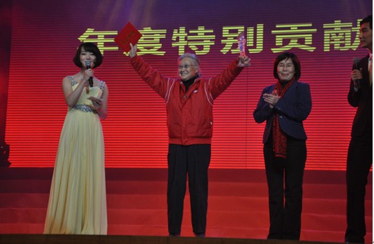 在为同学们创造更好的运动环境,促进北大体育运动蓬勃发展方面,不少教师、学生或团体组织做出了突出贡献,因此,活动设置了年度特别贡献奖。92岁高龄的体育教研部喜勋教授获此殊荣,校党委副书记叶静漪为她颁发了奖杯和证书,并对她60年如一日为北大师生体育健康事业发展做出的贡献表示了肯定和感谢。