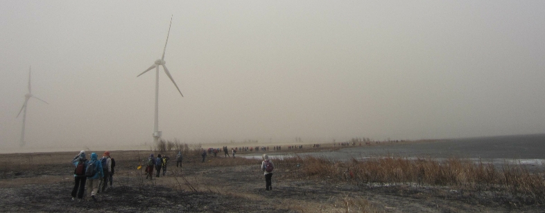 在与主办方会合后,我们就下车准备徒步,大家都把自己包的严严实实,只露出眼睛,有的甚至用纱巾把头给包住,由于女性居多,大家穿着五颜六色,在漫天黄沙下,徒步前行,不得不承认这是一道美丽的风景。一路上也顾不得左看右看的,但是那大大的风车在风中转动的情景让我在心里盘算着它能发多少电。走了不多久,就到了官厅水库,水库上还有冰,在风的作用下,虽然穿了三件衣服,感觉还是挺冷的。