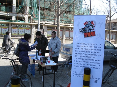 “欢迎加入壁球协会!”“打什么球不怕PM2.5? 打壁球!”2013年3月13日,新成立的北京大学壁球协会在三角地进行了第一次现场招新。协会的骨干们在寒风中用饱满的热情向来往的同学们发放宣传单、介绍壁球协会,还摆出了壁球拍、壁球、展板等为同学们揭开壁球这项新兴运动的神秘面纱。据悉,这是内地高校成立的第一家学生壁球社团,在推广壁球的运动中,北大又一次走在了时代的前列。