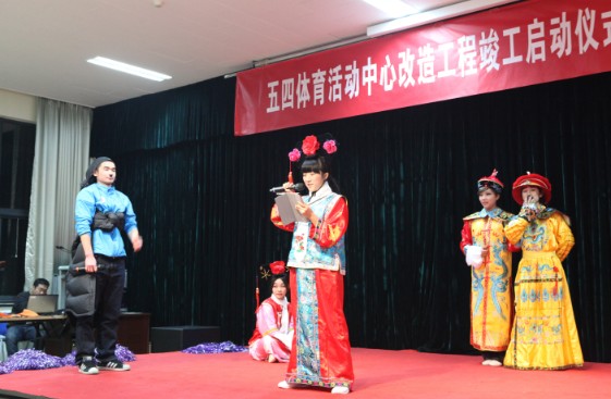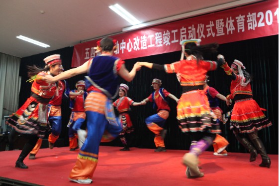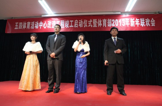 在简短的竣工仪式过后,2013年体教部新春晚会隆重登场,担任此次晚会主持的是体教部教师吴昊、2011级研究生廖倩雯、2009级光华管理学院篮球体特生奇峰、2010级新闻与传播学院健美操队方梦琦。