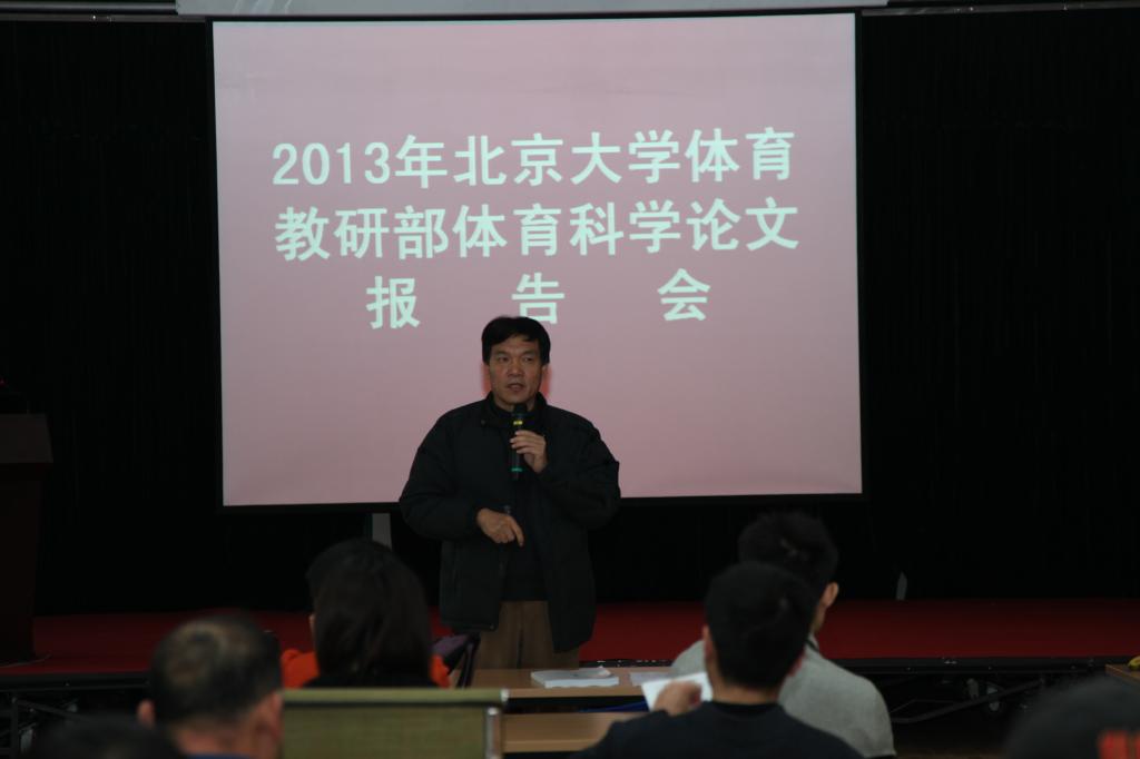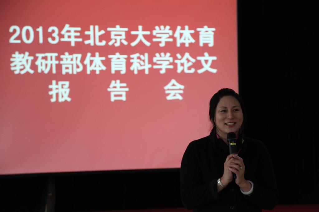 随后,耿琴部长向在场师生作了“北京大学人文社会科学科研工作汇报”。通过项目工作、成果展示、服务国家重大现实需求等三个层面,在纵向上让我们了解北京大学与国内其它高校、国际名校之间的项目对比情况;横向上呈现了体教部与校内其他院系之间的科研开展情况。尽管受到学科限制、经费不足等原因的影响,但体教部的科研工作始终孜孜不倦,脚踏实地,在2012年北京市“第十二届哲学社会科学优秀成果奖”评选中,体教部书记张锐教授的“中国奥运经济波动与各届奥运经济周期性的特点比较分析”在众多课题中脱颖而出,荣获二等奖,为北大的科研繁荣、体育学科的发展作出了贡献。