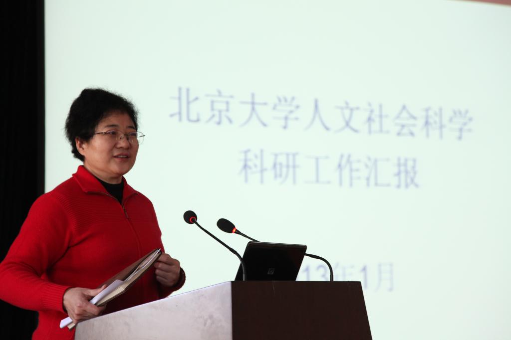 作为学校科研主管部门的领导,北京大学人文社科部副部长耿琴发表了讲话。耿部长首先对2012年体教部科研领域取得的成果和荣誉表示赞赏和褒奖,特别提到在近年来体教部在教育部、国家社科基金重大课题中的科研成果。