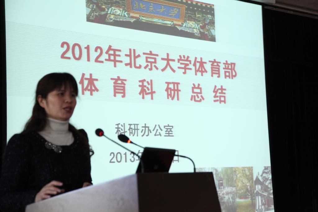科研办公室主任董进霞老师首先对2012年体育部科研工作进行汇报。回顾过去一年来体教部在科研方面取得的成绩和科研成果,令人欣喜,催人奋进。通过“完善管理,加大扶持力度,激发科研兴趣;加强国内外交流,提高社会影响;抓好立项,数量和质量齐突破;举办学术活动,扩大社会影响;科研经费有所突破,科研成果相对稳定”等五个方面的努力,在课题申报方面,2012年体教部获得国家级课题立项2项,省部级课题3项,体育部课题4项,其他课题4项,共计13余项;著作出版方面,出版2部著作,在正式刊物上发表10篇文章;先后举办了“百年大学·百年体育”高层论坛,“芬兰:学校体育国际论坛”、“体育与女性生活质量”研讨会等多项学术活动,受到各界专家学者的赞誉;对内扎实基础的同时,体教部积极开展对外学术交流,先后派出50余人次参加国内外重大体育科学研讨会及论坛,多位教师及学生作专题报告或大会发言,不仅开阔了学术视野,了解学科前沿,也很好地扩大了北大在体育科研领域的国际影响力,实现了2012年体教部科研的大丰收。