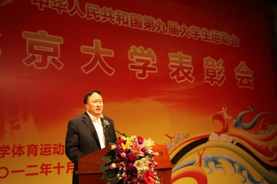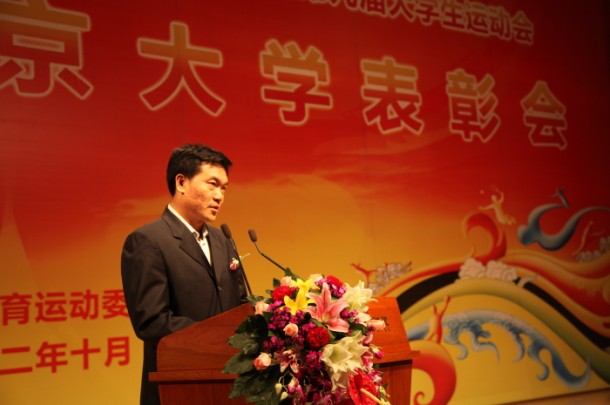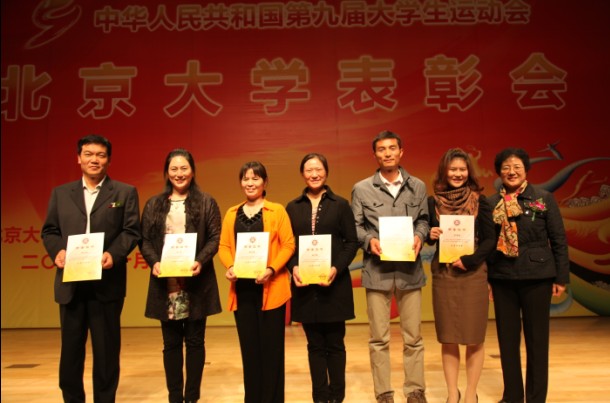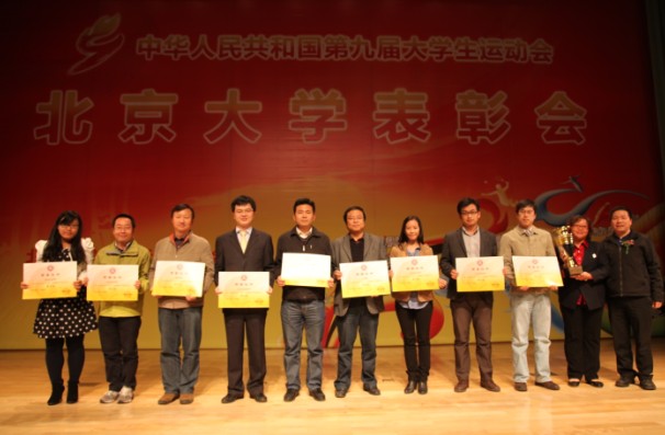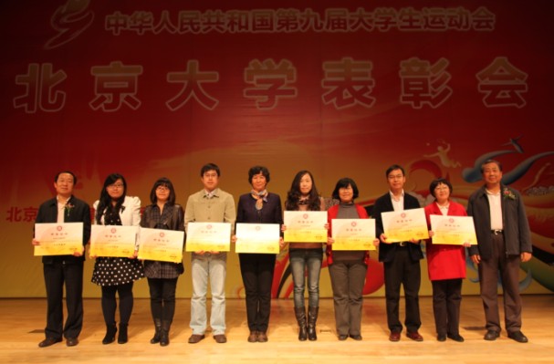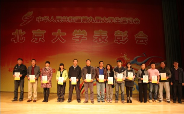 10月25日傍晚,中华人民共和国第九届全国大学生运动会暨伦敦奥运会“北京大学总结表彰大会”在百周年纪念讲堂多功能厅隆重召开。北京大学党委书记朱善璐,教育部体卫艺司司长王登峰,北京市教育委员会体美艺处处长王东江,北京市大学生体育协会主席杜松彭出席大会并发表讲话。北京大学副校长、体育运动委员会主任刘伟,北京大学校务委员会副主任、体育运动委员会名誉主任岳素兰,北京大学党办校办主任、校长助理马化祥等校领导也出席大会。全校各院系主管体育的领导、获奖运动员及教练员代表、学生体育社团负责人、体教部师生等均到场参加。会议由体教部副主任刘铮主持。