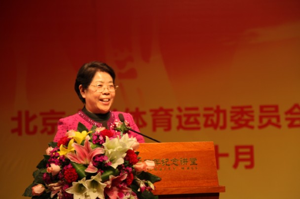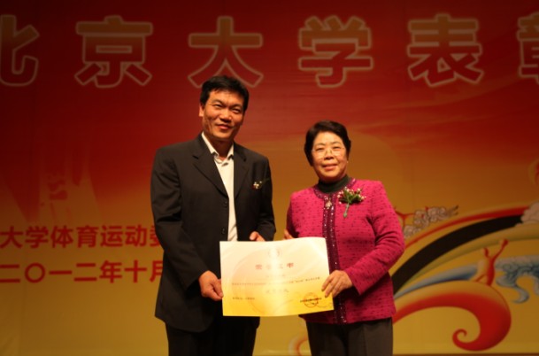 北大校务委员会副主任、体育运动委员会名誉主任岳素兰宣读表彰决定