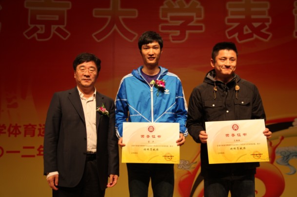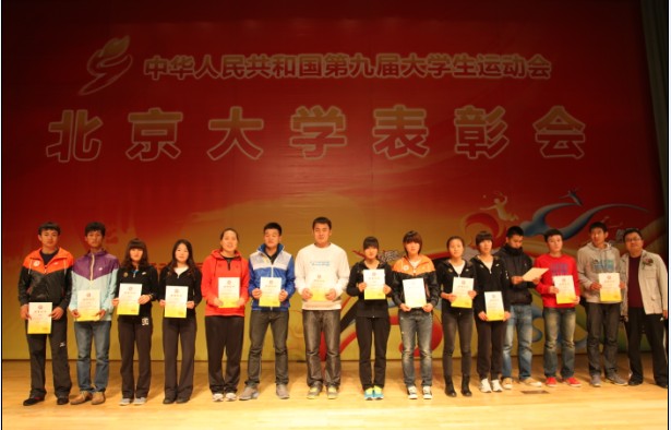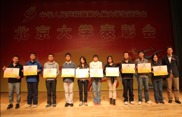 对我校参加中华人民共和国第九届大学生运动会的黄桂田、郝光安、刘铮3名领队,滕炜莹等19名教练员,李梦等45名运动员、张锐等6名科研人员进行表彰;对新闻与传播学院等10院系授予“突出贡献奖”;对在第30届夏季奥运会中荣获男子花剑冠军的雷声同学及教练王海滨授予“特殊贡献奖”;为在本届大运会夺得“校长杯”积极准备、刻苦训练,取得优异成绩不懈努力的体育教研部颁发“优秀团队”;同时,对医学部(校本部)等在“北大杯”系列联赛中取得前十名的院系、对山鹰社等在促进学生课外体育锻炼方面表现突出的10个体育社团进行表彰。作为获奖代表,伦敦奥运会男子花剑个人冠军雷声同学结合北大的学习生活感悟发表感言。